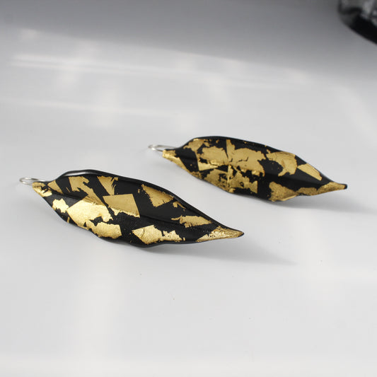 Handcrafted Ebony Wood Leaf Shaped Earrings with 24k Gold Leaf Design