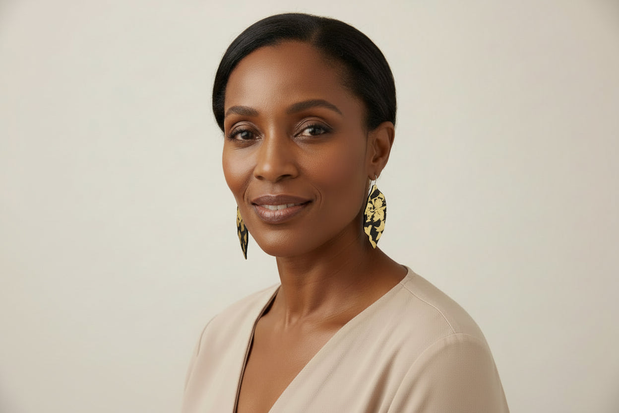 Elevate your style with our Handcrafted Ebony Wood Leaf Shaped Earrings, featuring a luxurious freestyle pattern of 24k gold leaf design. Expertly created from hand-carved ebony wood, these earrings showcase the natural elegance of ebony and the opulence of gold leafing. Perfect for those who appreciate unique craftsmanship and sophisticated design, these earrings add a touch of luxury and nature-inspired beauty to any outfit.